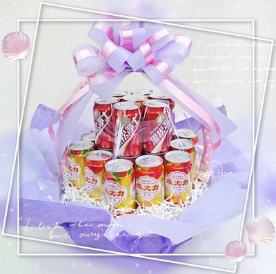【使用花材】緞花.籐籃.汽水飲料(百事可樂.可口可樂.舒跑.維他露P.金車沙士.黑松沙士等).茶品(御茶園.檸檬紅茶.道地烏龍茶等)配搭